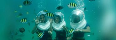 Sea walking is a different kind of adventure for you to see the corals and the numerous fishes swimming around you up close. You can also feed them and be ready to be swarmed by different kinds of fish. This is done by wearing a helmet with oxygen, so you can breathe underwater. You will be lowered down and guided by divers and lead you to walk on the sea bed and enjoy the corals and fish.